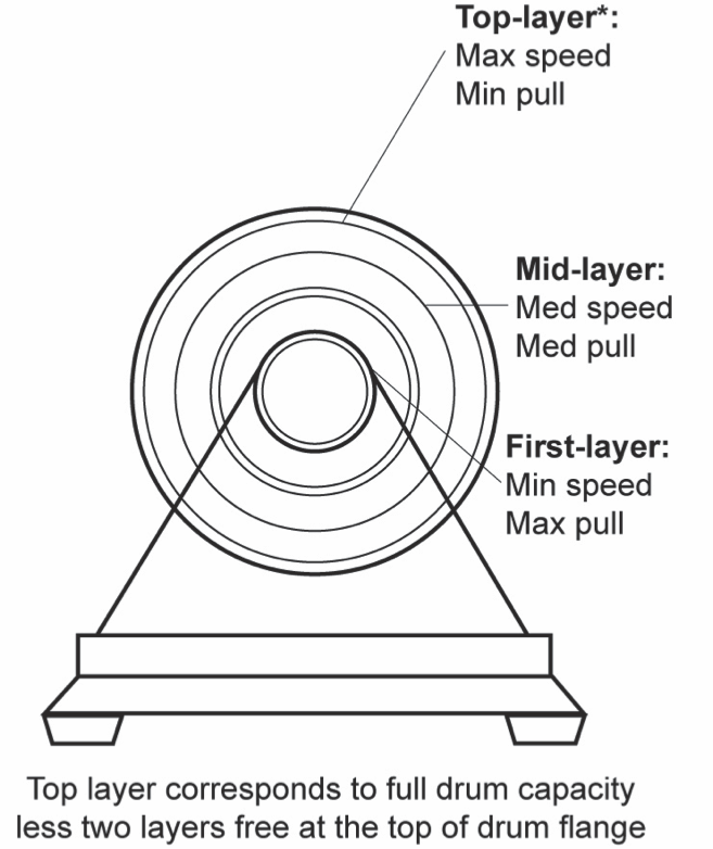 Winches can lift or pull the highest loads at the first layer, and can lift/pull the least at the top layer. This is due to the “torque arm” effect of the rope spooling on the winch drum. The closer the load is to the drum, the easier it is for the winch to turn and move the load. The further away the load is from the drum, the harder it is for the winch to turn.