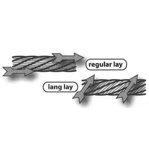 Lang Lay wire ropes have both the wires forming the strands and the finished strands twisted the same direction, either right or left, and causes the finished product to appear with the wires running diagonally to the axis of the rope. The advantage of Lang lay rope is the increased abrasion resistance leading to a longer lifespan, but that comes at the price of flexibility.