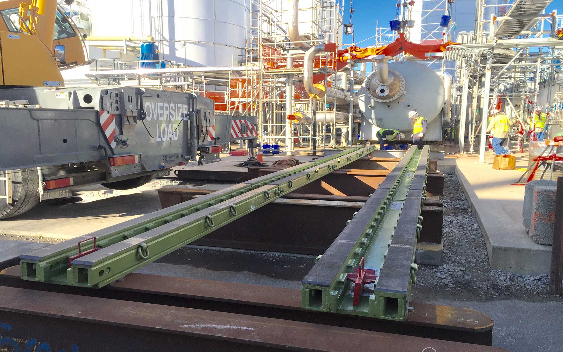 Our Hydra-Slide Skidding System can get where cranes can’t. Using a heavy track skidding system is a great alternative to using a crane when challenges arise.