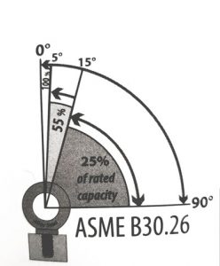 With that out of the way, the flaw in eye bolt use lies in the reduction based on the angular forces. While ANSI/ASME has two separate guidelines in B18.15 and B30.26, the manufacturer is your best resource for knowing the actual working load limit (WLL) for your application. Absent that information, however, your safest practice is to run with the capacity reductions listed in ANSI/ASME 30.26 in which they show that an eye bolt retains 100% capacity up to five degrees from the vertical.